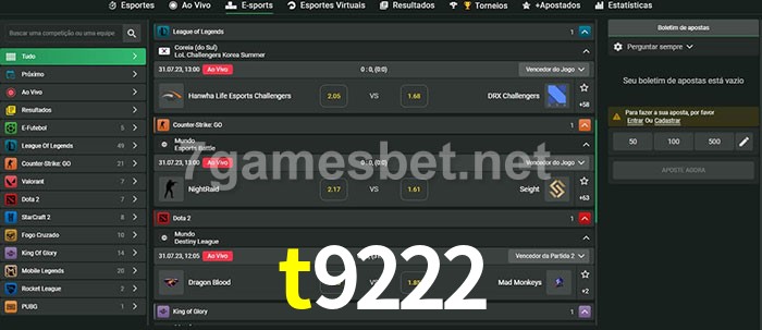 A aposta t9222 oferece aos jogadores a experiência mais conveniente de apostas em eSports!